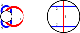 Figure 2. A graph embedded on the torus (left) and the corresponding ribbon graph (right). It has four quasi-trees with edge sets $\{1\}$, $\{2\}$, $\{3\}$, and $\{1,2,3\}$.